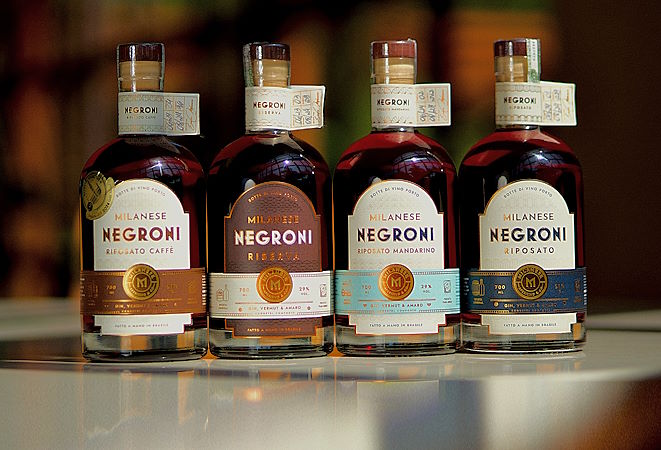 Mas uma empresa paulistana apostou forte no coquetel e produz uma linha com quatro opções engarrafadas: a Milanese. Apesar de o Negroni ser uma receita simples e fácil de preparar, a versão da marca evoluiu para opções mais sofisticadas, com envelhecimento de 2 a 12 meses em barricas de carvalho francês anteriormente usadas para vinho do Porto e adição de adjuntos. Aliás, cada barrica rende apenas 300 garrafas e todas são numeradas a mão, com data da produção, do envase e número da barrica. Esse processo proporciona não só uma exclusividade, mas também uma complexidade única ao sabor, permitindo que os aromas do carvalho e as notas do vinho se integrem aos ingredientes do Negroni, resultando em uma bebida mais rica e refinada.