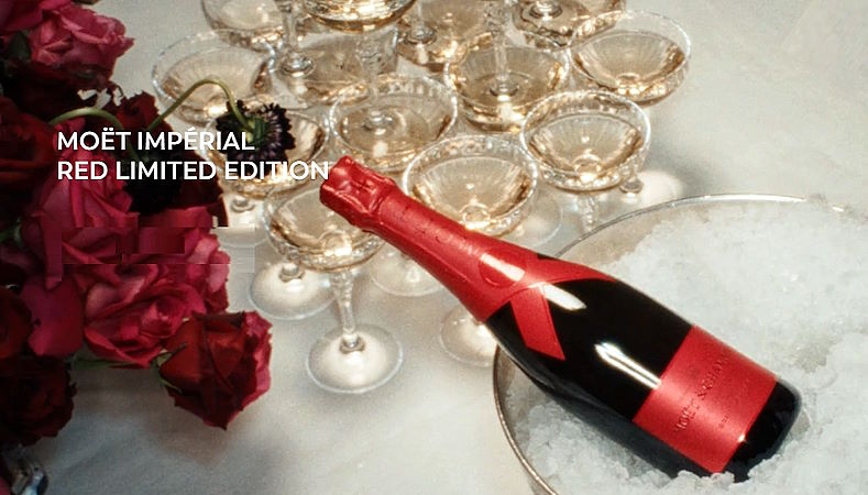 Segundo a Moët & Chandon, as cores vermelho e rosa foram escolhidas para representar a conexão humana, amor e celebração, essências da marca. A vibrante garrafa vermelha do Brut convida a brindar com amor, elegância e muita cor enquanto o rótulo rosa do Rosé traz uma expressão espontânea, radiante e romântica.