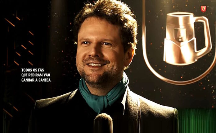 O ator Selton Mello vive um apresentador de premiação de cinema em ação promocional de Spaten que anuncia a chegada das suas canecas celebrativas