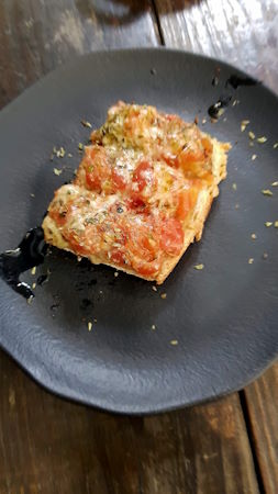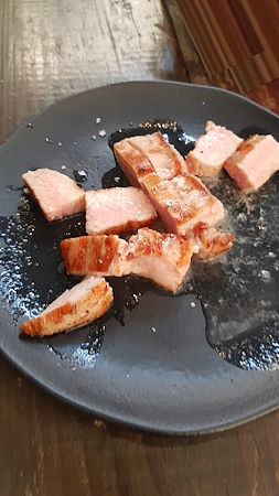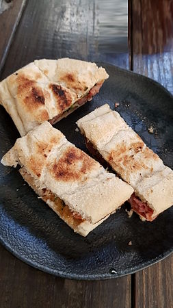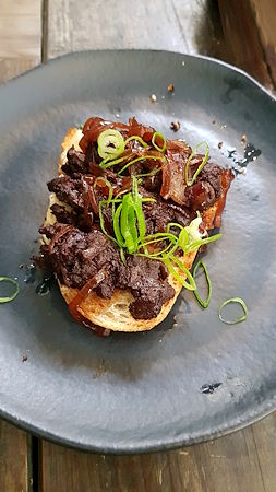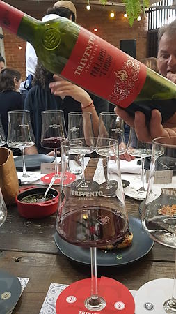 Em seguida provamos o Trivento Reserve White Malbec, que, como o próprio nome diz, é uma proposta de vinificar a Malbec sem as cascas para gerar um vinho branco. Ele tem um sabor de frutas cítricas, como acerola, e brancas, como lichia, e um leve aroma floral. É um vinho fresco, refrescante, leve e equilibrado. Também de ótimo custo-benefício, é uma excelente opção para fugir dos tradicionais Sauvignon Blanc ou Chardonnay e ideal para acompanhar entradas leves, como a Bruschetta de Morcilla Doce que abriu o almoço.